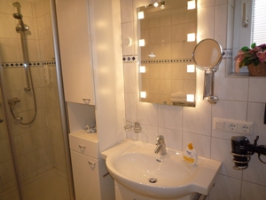 Bad mit 1 Waschbecken, Föhn, WC und Duschbad.