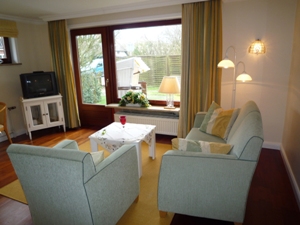 Ausstattung: Wohnzimmer mit Couchgarnitur, Esstisch, Holzfussboden, CD-Player, Farb-TV, Telefon, Ausgang zur Terrasse.